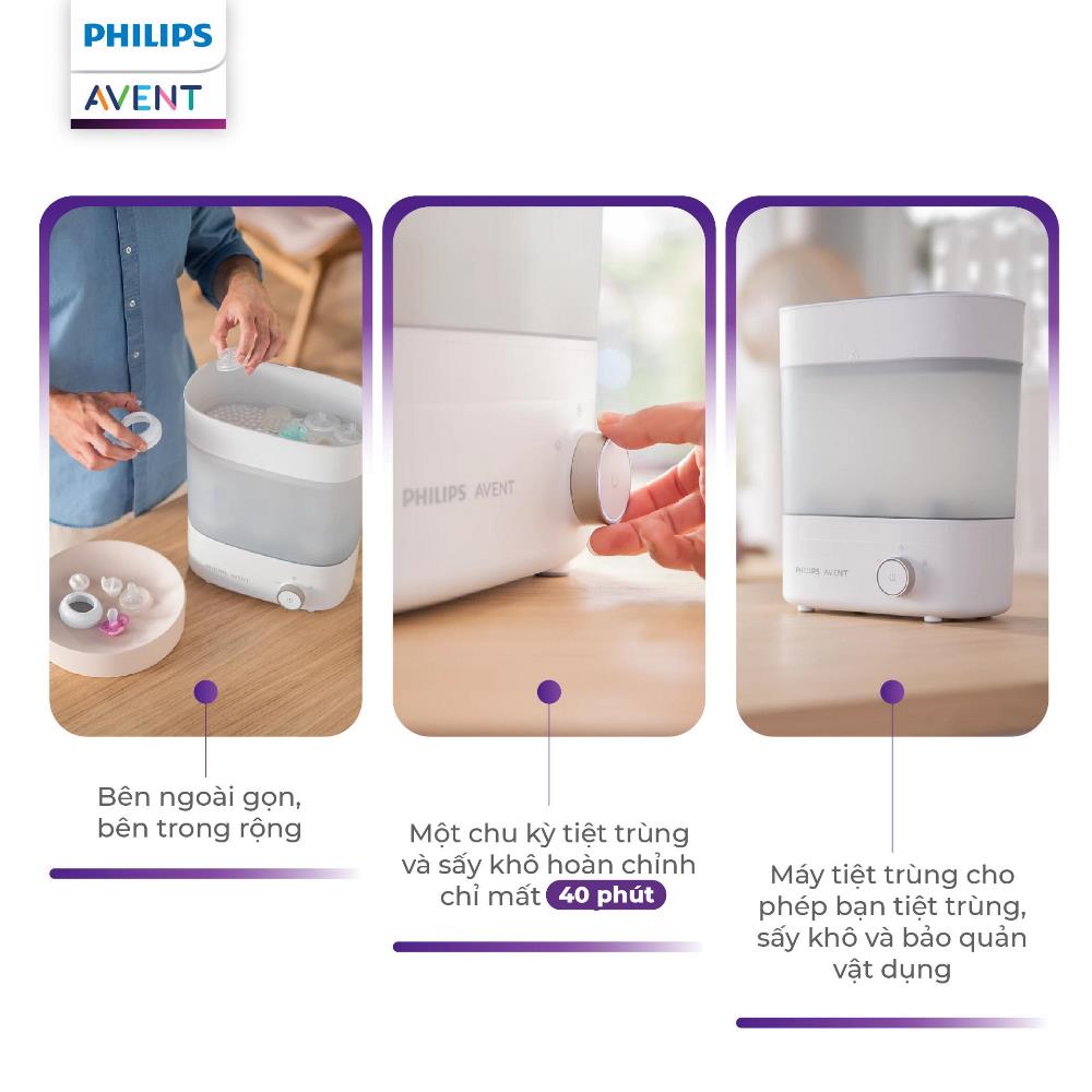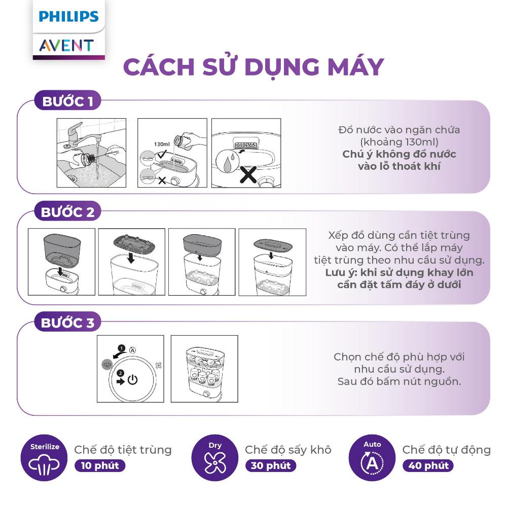 - Chu trình hoàn chỉnh chỉ 40 phút: kết hợp tiệt trùng và sấy khô nhanh chóng, giúp tiết kiệm thời gian cho mẹ.