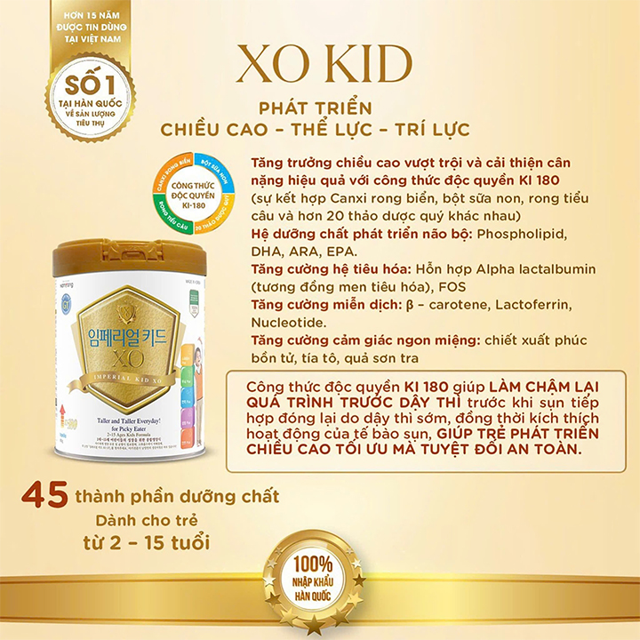 Ra đời sau sự thành công của “ dự án 5-5-5” (5 giải pháp cho mỗi vấn đề về sức khỏe), được bổ sung công thức dinh dưỡng độc quyền KI 180 đã được chứng nhận độc quyền tại Hàn Quốc, sữa xo Kid 800g có tác dụng thúc đẩy sự tăng trưởng của trẻ mà tuyệt đối an toàn, làm chậm quá trình dậy thì sớm.